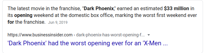 And the movie DARK PHOENIX was out, opening at 33 million dollars